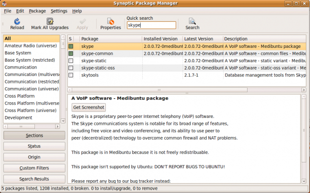 Confirm by pressing the Enter key and enter your password. The system then completed the list in Synaptic Package Manager for another source, this time for a range of multimedia resources. Now reopen synaptic package manger and search for Skype.
