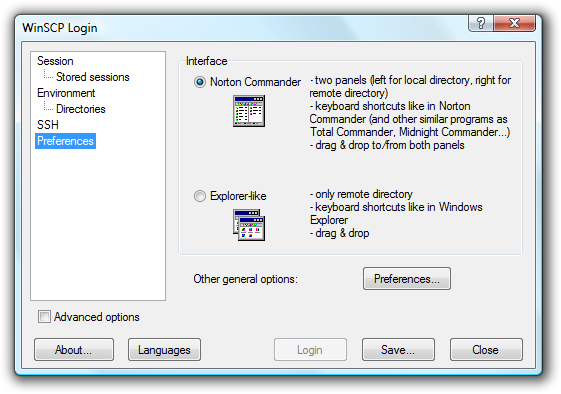 Start WinSCP and click the Preferences link in dialogue for the connection selection. Then click on the Preferences button on the right.